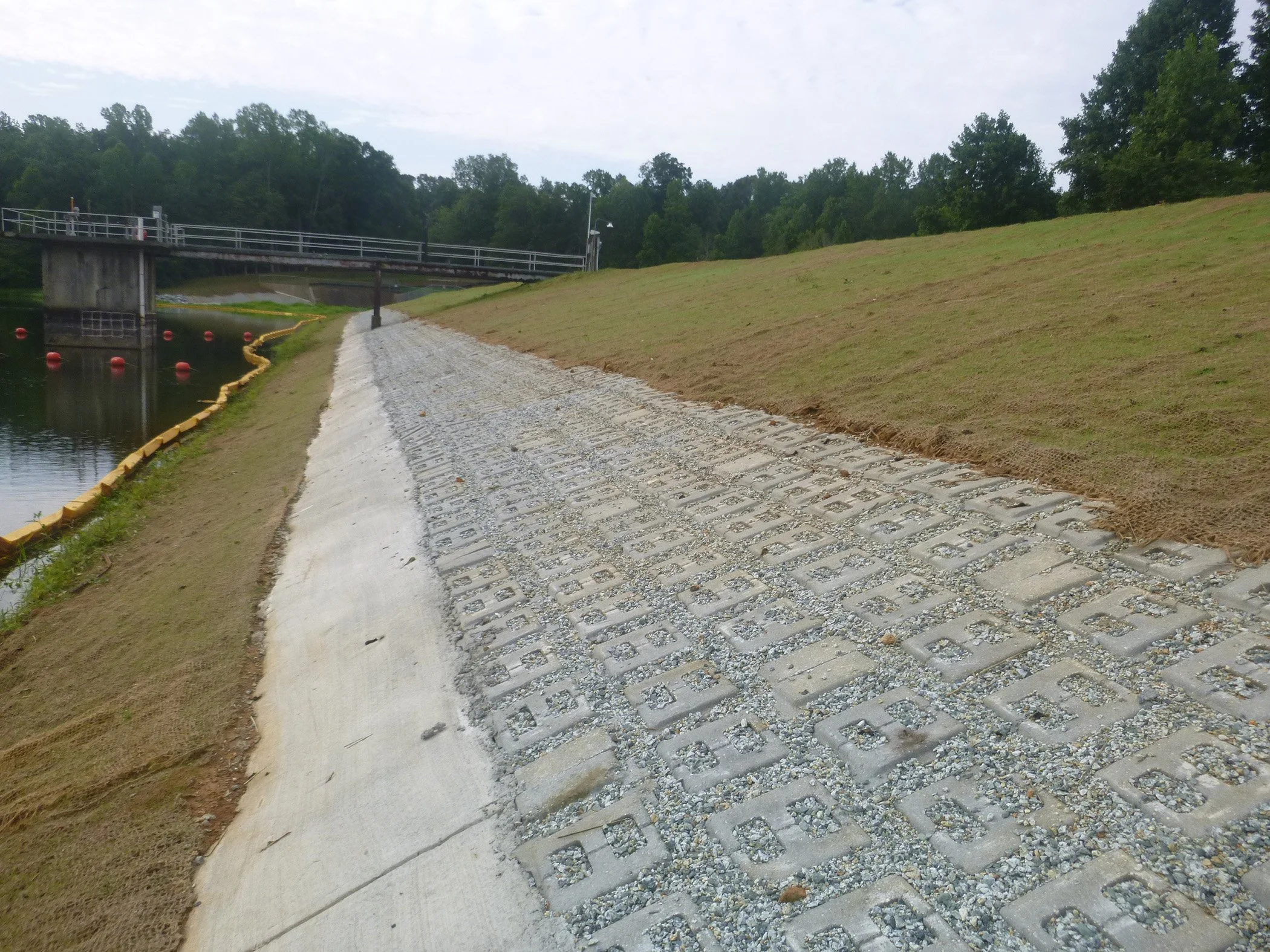 Riprap is a layer of different sized stones that reduce erosion on steep surfaces. These disrupt the flow of water that would normally run down a slope which helps to keep the soil in place and protect stream banks, dams, and bridge crossings. Riprap is low maintenance and durable and can be used to protect infrastructure; however, it has environmental drawbacks that cause the NCDEQ to regulate it. Riprap can heat up ponds and streams and the fact that it is made of rock can affect animal habitats. To avoid environmental damage, riprap is best combined with other methods such as vegetation to protect the soil, provide habitats, and maintain water temperature.